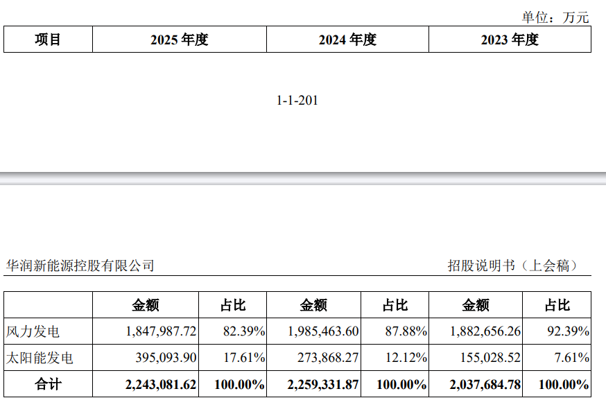 报告期内,华润新能源主营业务收入分别为2,037,684.78万元、2,259,331.87万元和2,243,081.62万元,其中风力发电收入占比为 92.39%、87.88%和82.39%,太阳能发电收入占比为7.61%、12.12%和17.61%。