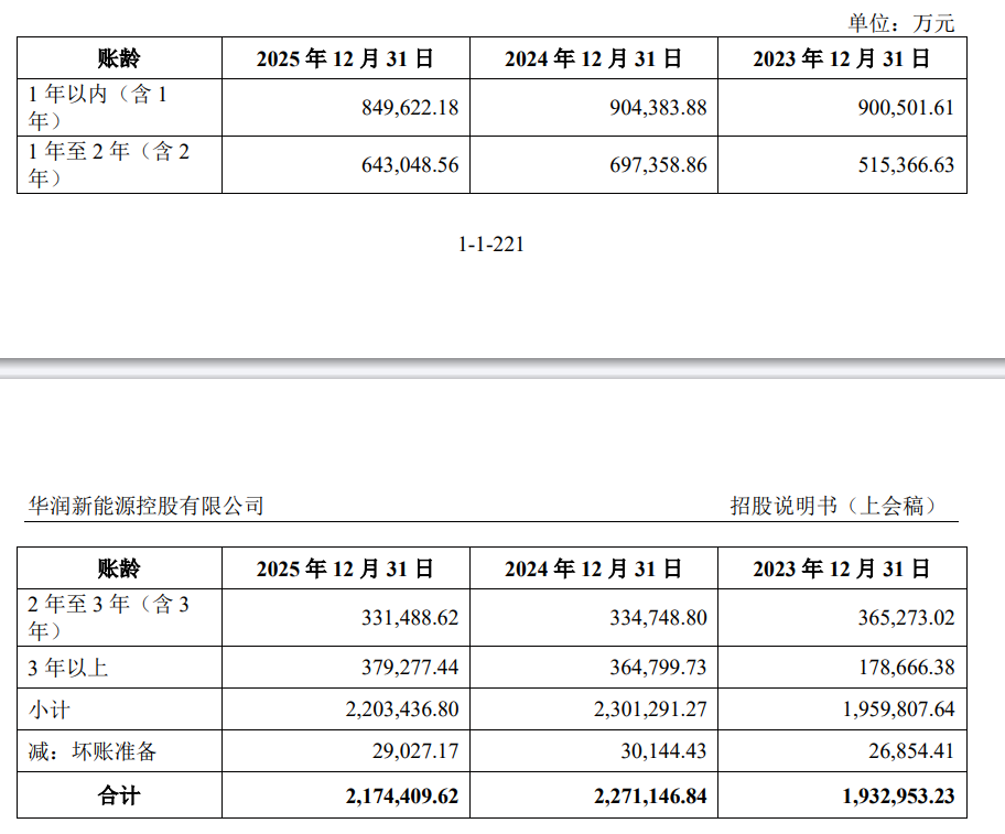 应收账款方面,2023-2025年末,华润新能源应收账款账面余额先增后降,分别为195.98亿元、230.13亿元、220.34亿元。整体账龄结构有所拉长,需关注账款回收风险。